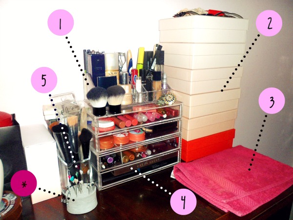 3. My uber soft pink towel that I use to dry my brushes on, any make up mishap, gets wiped on this. Its just handy to have on hand. (Don`t worry, it gets washed regularly, too.)